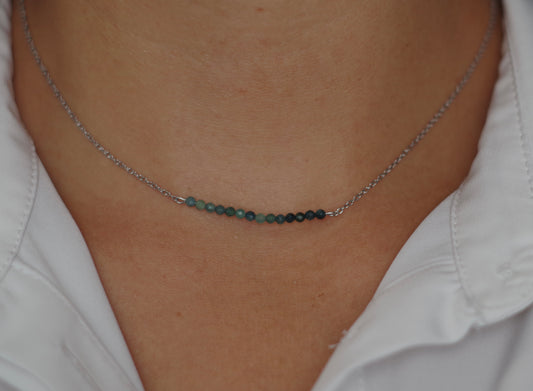 Blue tourmaline is often associated with peace, communication and clarity of mind. It is said to promote creativity, self-expression and emotional healing.